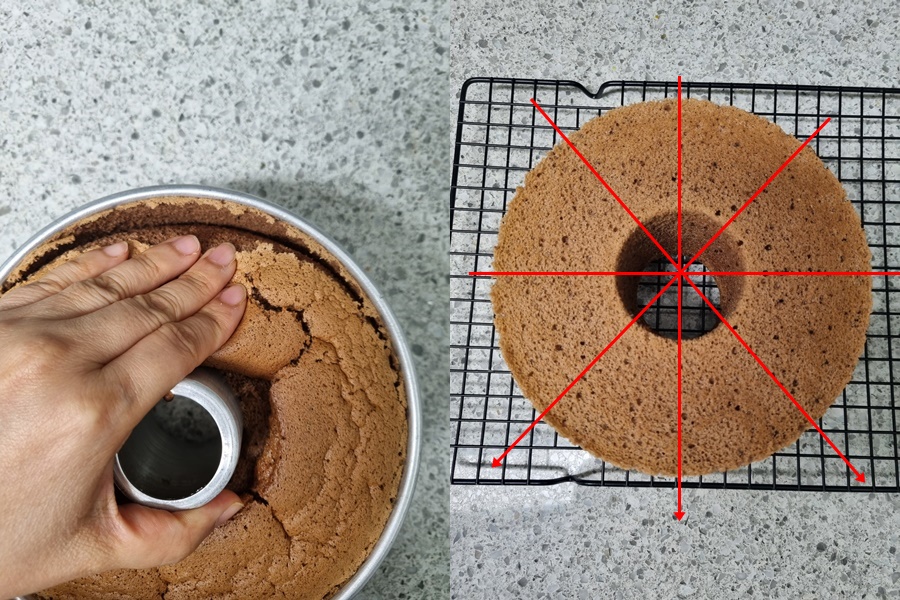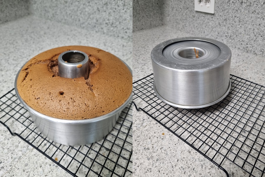 15. Remove from the chiffon mold from the oven, turn it upside down and leave it to cool.