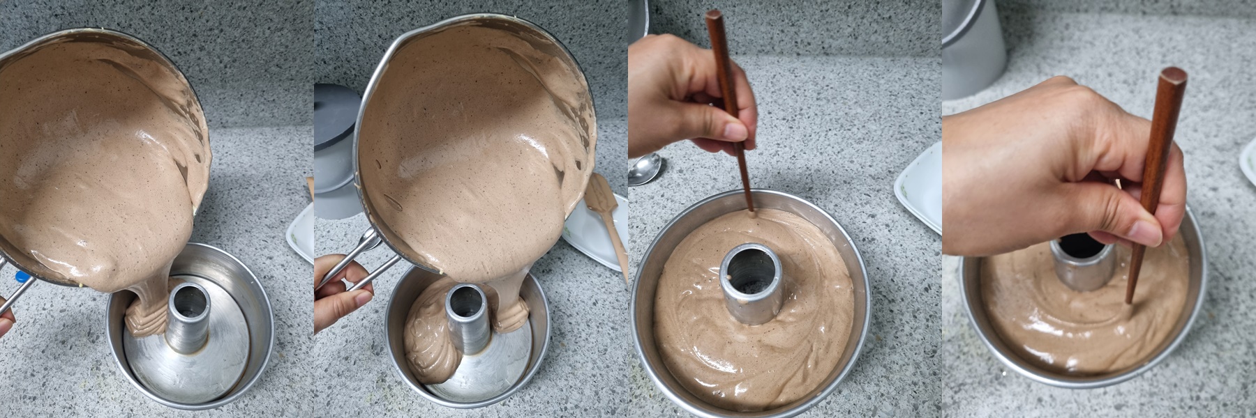 11. Pour the meringue into the chiffon mold in a flowing manner, removing any air bubbles.