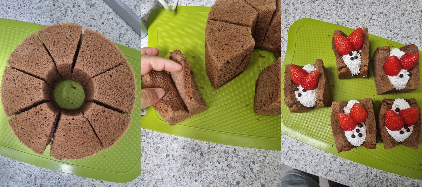 18. Cut the center of each piece and decorate it with whipped cream and fruit. Voila~!