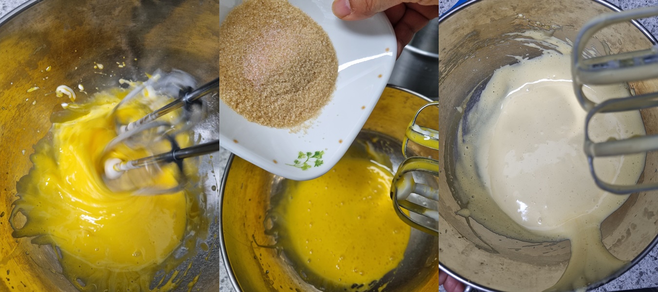 5. Add sugar and salt to the yolks and mix until white. (Use hand mixer at low speed).